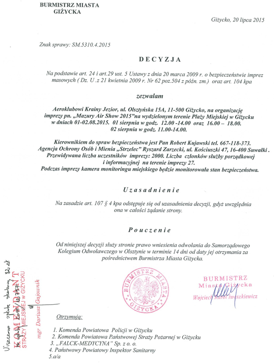 2015 oraz do Burmistrza Giżycka o formalne wydanie zezwolenia na realizację imprezy masowej.