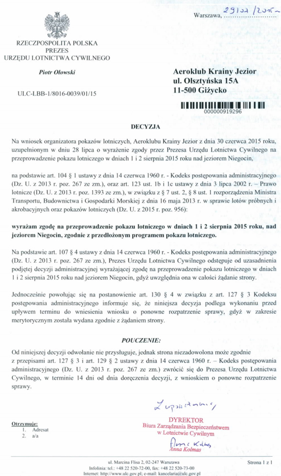 6/. został złożony przewidziany przepisami wniosek do Prezesa ULC o akceptację programu pokazów Mazury AirShow