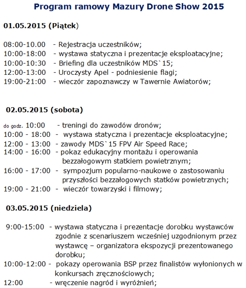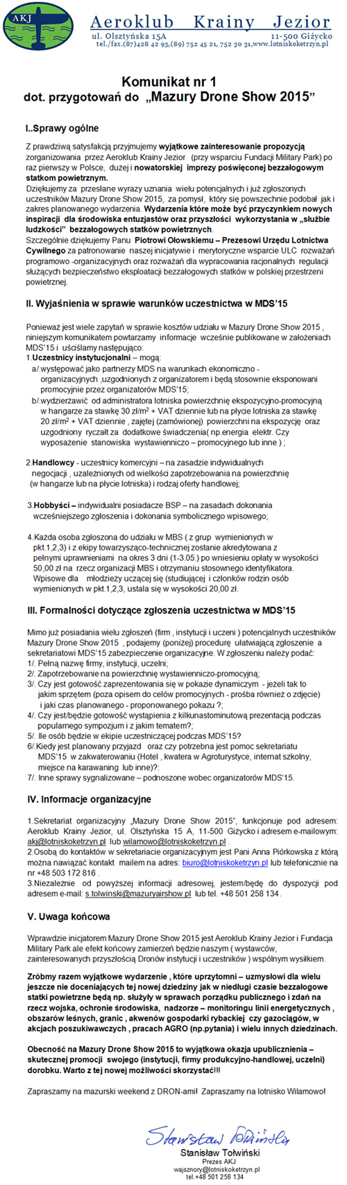 Doceniając narastające zainteresowanie bezzałogowymi statkami powietrznymi, postanowiliśmy w Zarządzie Aeroklubu Krainy Jezior wykreować nowa imprezę międzynarodową w Krainie Wielkich Jezior Mazurskich. Mając na względzie jak najszerszy udział entuzjastów przyszłości i wieloznaczeniowego wykorzystania DRONÓW w XXI wieku, publikujemy poniżej "Wstępne założenia ..." z zaproszeniem do zgłaszania uwag i ważnych sugestii. Będzie nam miło jeżeli znajdą się chętni do współpracy w okresie przygotowań jak i aktywnego udziału w wybranych elementach założonego programu.