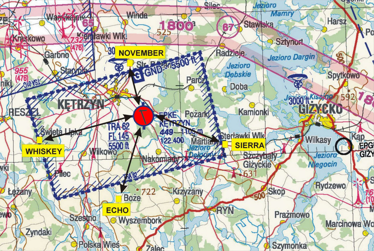 | Utrata orientacji geograficznej w rejonie lotniska – przyjąć KD=90° i po wyjściu na linię jezior Mamry i Śniardwy – wznowić orientację szczegółową i wykonując lot wzdłuż drogi Giżycko – Kętrzyn powrócić na lotnisko. | |