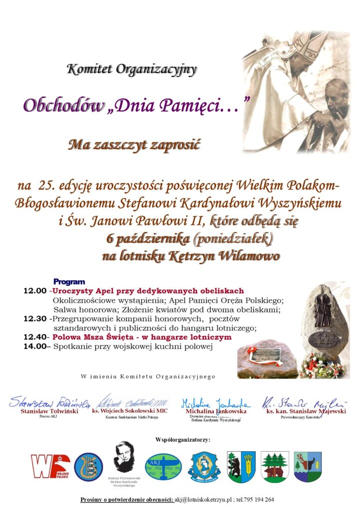 W tym roku, już po raz 25-ty jak zwykle obchody „Dnia Pamięci…” odbędą się na lotnisku Kętrzyn Wilamowo dnia 6.10.2025 r. o godzinie 12.00, w uroczystej i bardzo podniosłej atmosferze, na których zapewne nie zabraknie nikogo komu wartości głoszone i postawa obywatelska Prymasa Tysiąclecia Błogosławionego Stefana Kardynała Wyszyńskiego oraz nauki Ojca Świętego są bliskie.